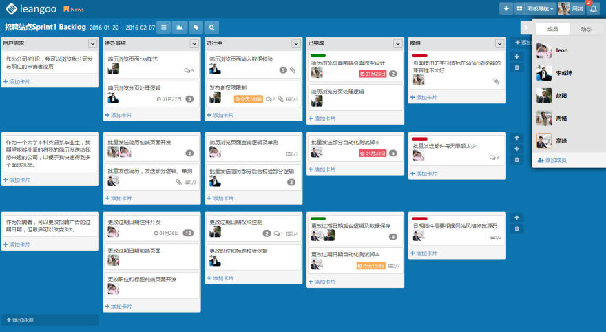 其他同类软件虽然都有任务板的功能,但不是其核心,更多的是基于任务的管理 。“我们希望走一条专业且深入的路线,专门为软件公司提供服务。”廖靖斌介绍到,leangoo将所有的一切都归纳在“看板”中。围绕看板展开协作把团队的近期目标、待办任务事项放到看板上,每个人都可以看到看板的实时变化,了解任务的进展状况。同时通过结构来把需求与任务的对应关系可视化出来,也便于对任务分类的对应关系进行管理。“看板”的主要元素有四个,列表、泳道、卡片、成员。