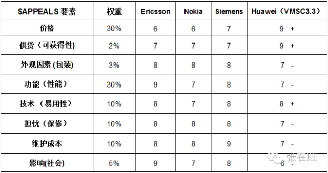 这是华为与竞品的打分结果(基于$APPEALS方法的衡量指标):
