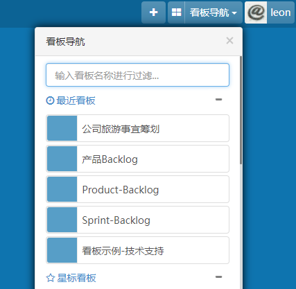 • 点击看板右上角“看板导航”,在下拉列表的第一个分区会显示您最近使用的5个看板,并按时间倒叙排列。