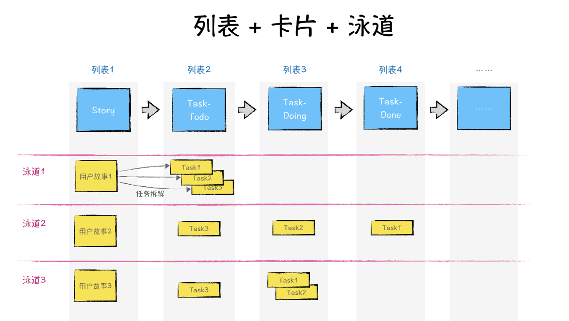 • 卡片表示用户故事或者任务,而如果这个用户故事或者任务还拆成了一些子任务,多数工具是让你在卡片之内添加「检查项」,这其实很不直观,也难以评估子任务的进度状态,而Leangoo中,由于加入了泳道,子任务不再是卡片内的检查项,而是一张完整的卡片;