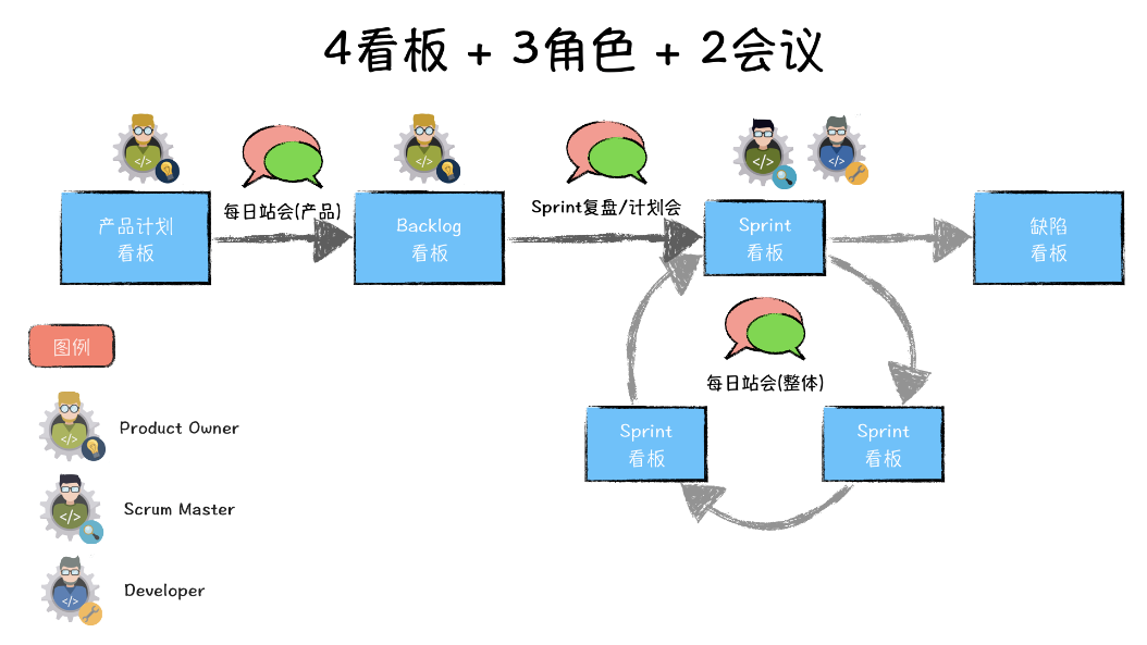 西瓜团队基于Leangoo官方推荐的看板模板,进行了一些小小的拓展,简单总结就是4种看板,3种角色,2种会议: