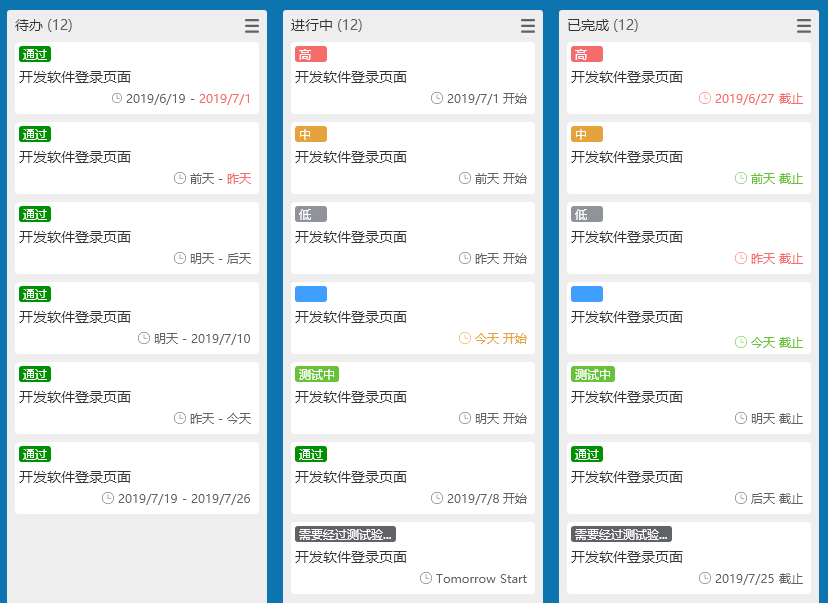 • 绿色:当将已完成的任务拖拽到完成列或勾选截止日期前的完成选项时,开始和截止时间都会显示为绿色,代表任务已经完成。
