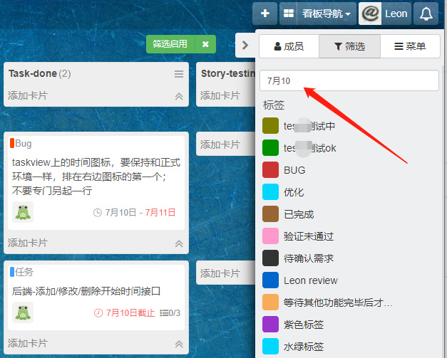 在侧边栏筛选分区,你可以通过输入相应的日期来筛选相关的任务卡片。