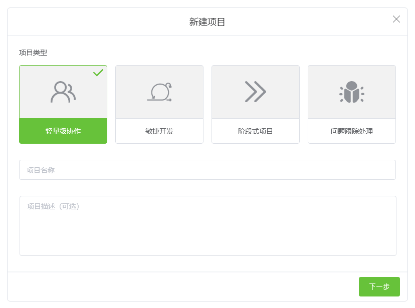 本次上线新增了3种项目类型,分别是“轻量级协作”,“阶段式”,“问题跟踪”项目类型。所以,目前共提供4种项目类型以及其对应的不同模板供大家创建项目时直接选用或参考。