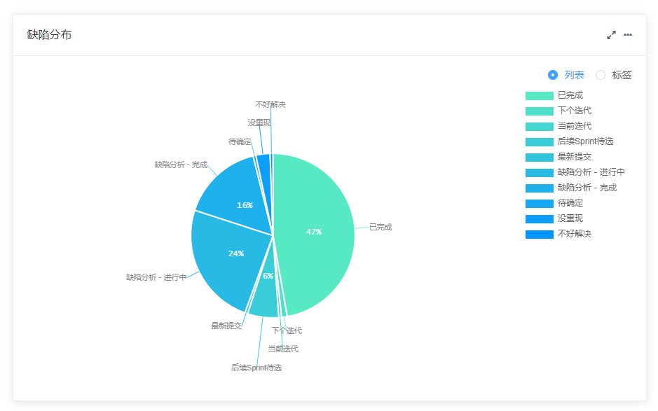 新版将项目内的统计都直接显示出来,方便大家直观查看项目进度,团队速度、缺陷分布等统计信息。