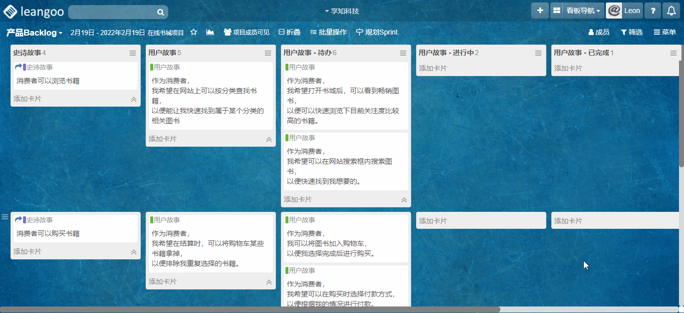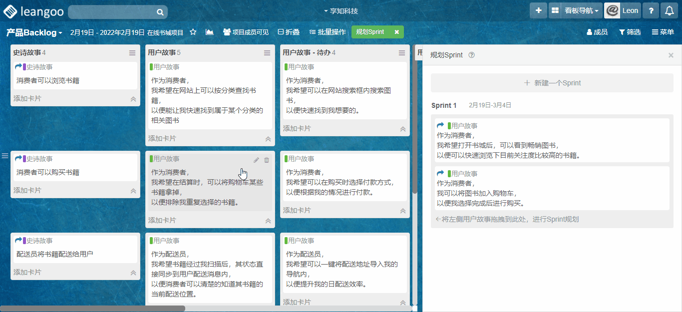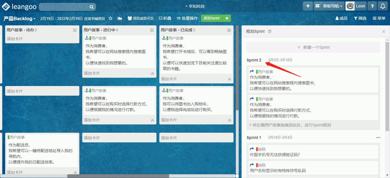 1, 在产品Backlog看板内,将用户故事规划到Sprint 上。