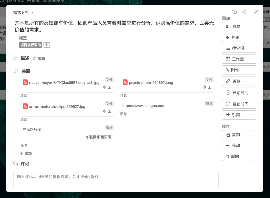 在看板或脑图的卡片上,我们可以根据需要将和任务相关的卡片、看板、脑图、项目、链接或文件直接关联到卡片上。关联后,我们可以快速查看和此任务相关的信息,快速浏览和访问相关内容,从而简化操作,提升便捷性。