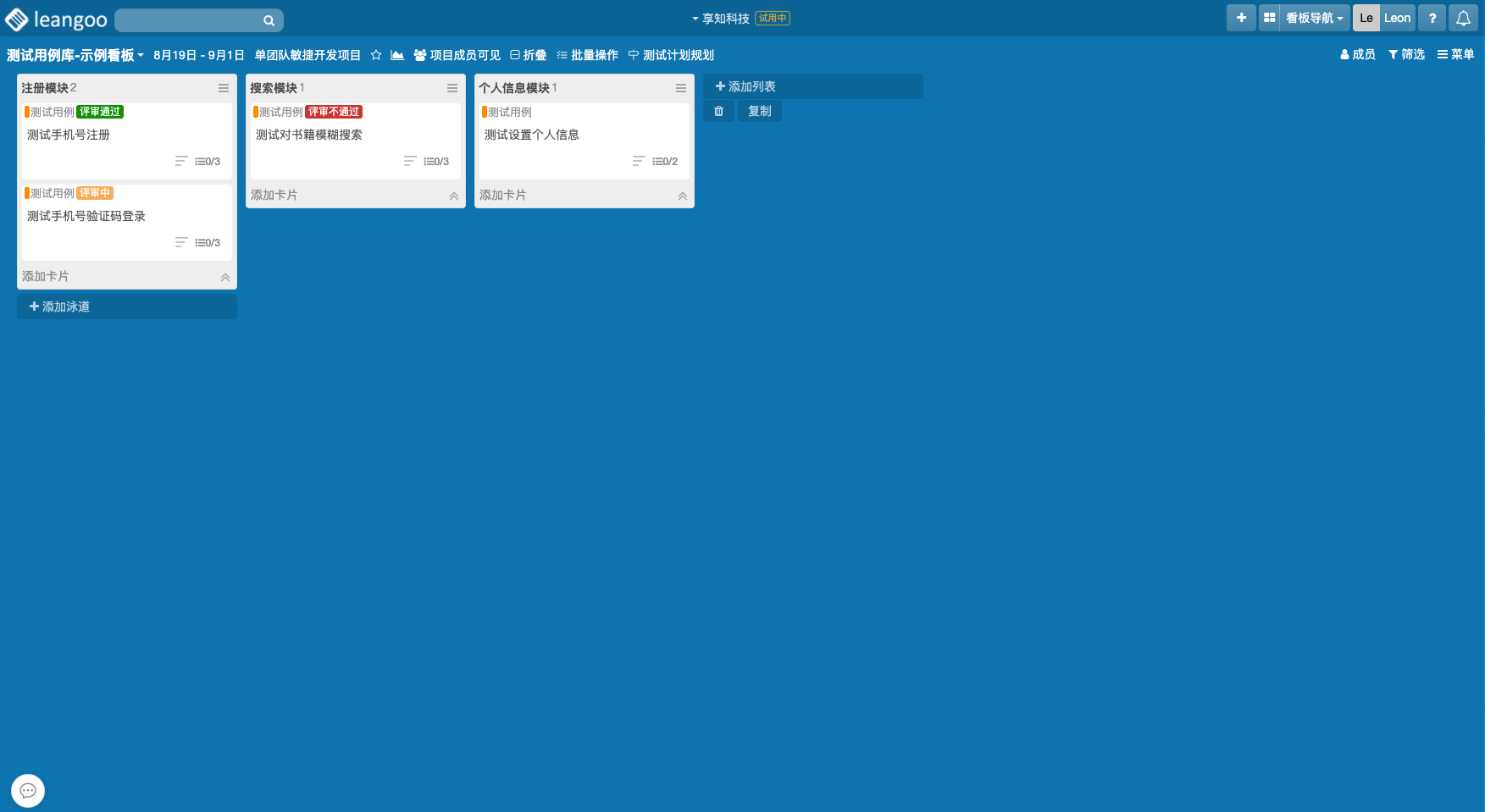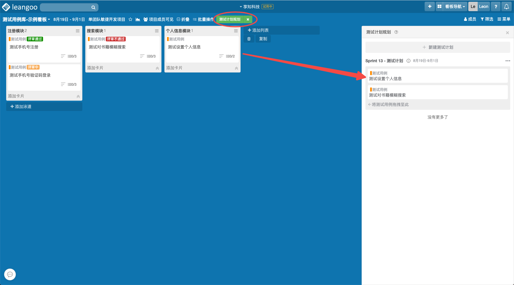 此时目标测试计划看板中就会生成相应测试用例卡片的副本,规划完后就可以开始执行测试计划,将测试用例卡片拖放到相应测试状态列表即可。