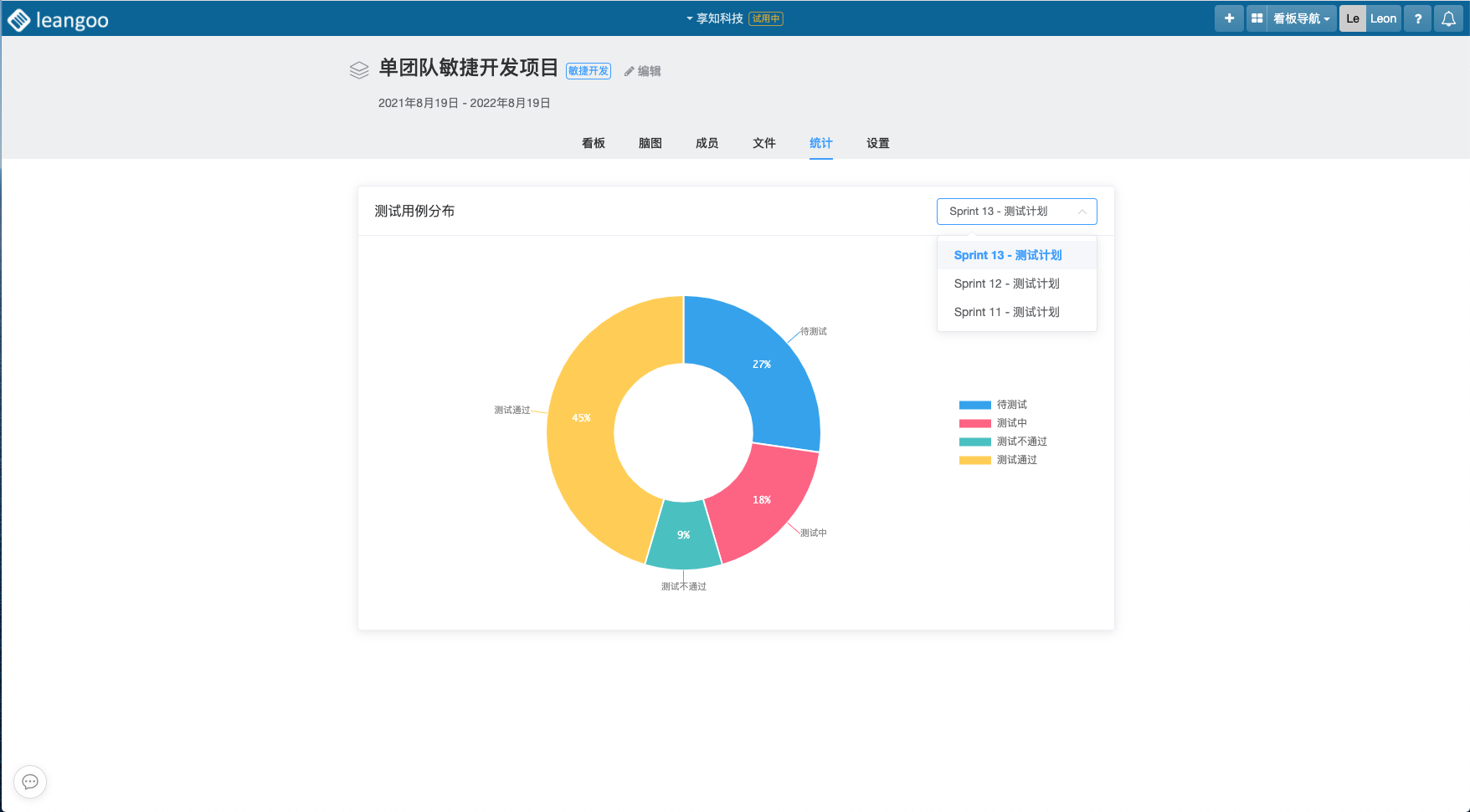 执行完测试计划后,可在项目统计tab页中查看测试计划执行结果,从选择框中选择相应测试计划看板,即可查看该测试计划的当前执行状态与结果。