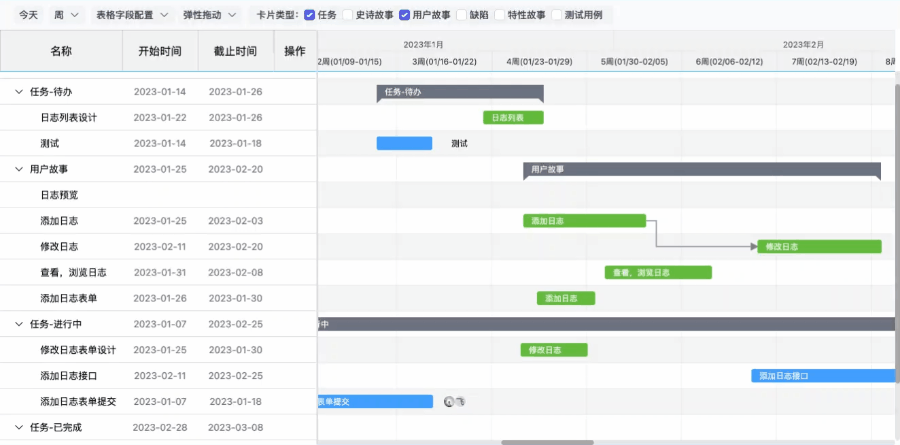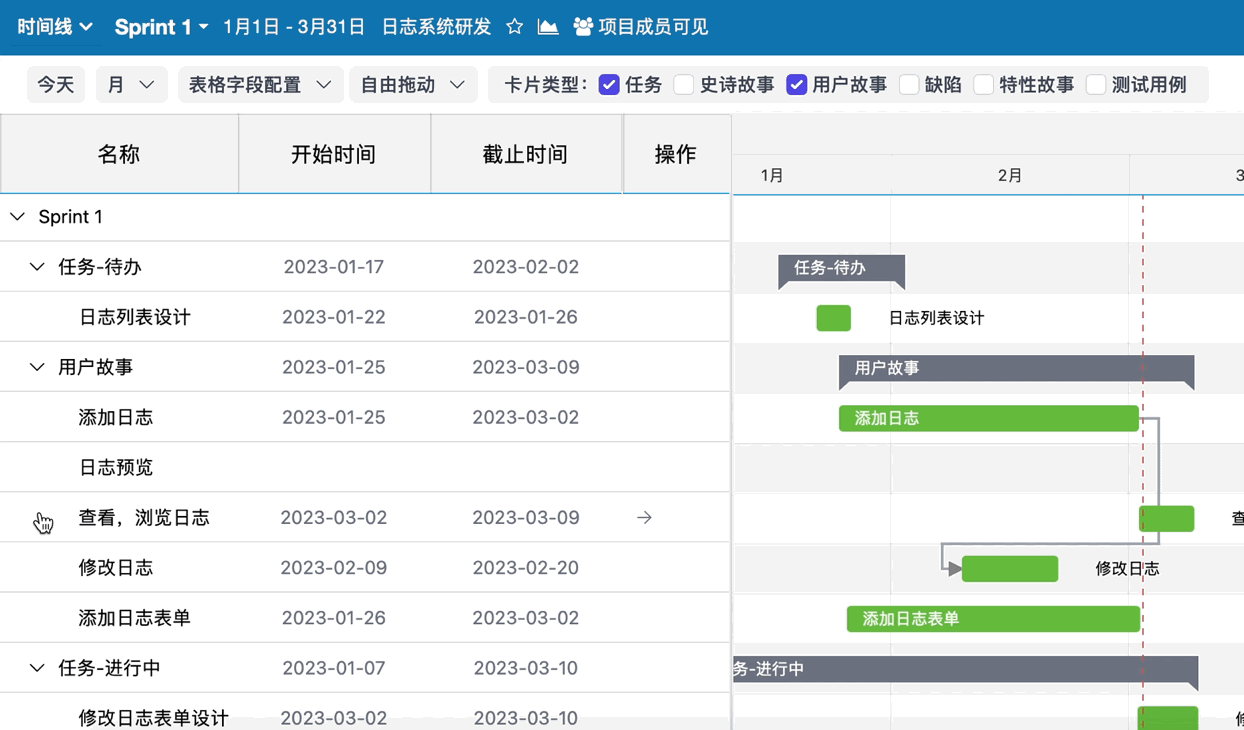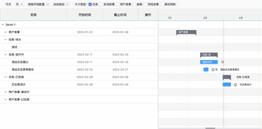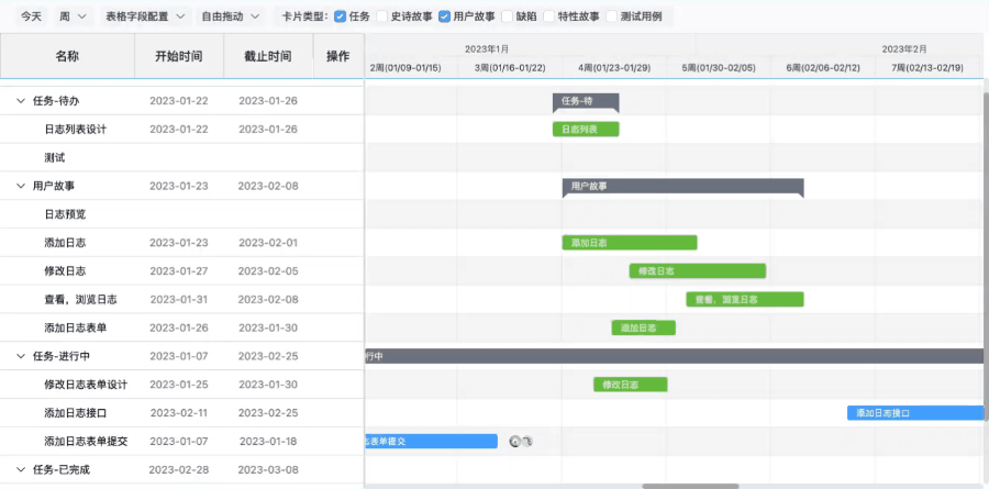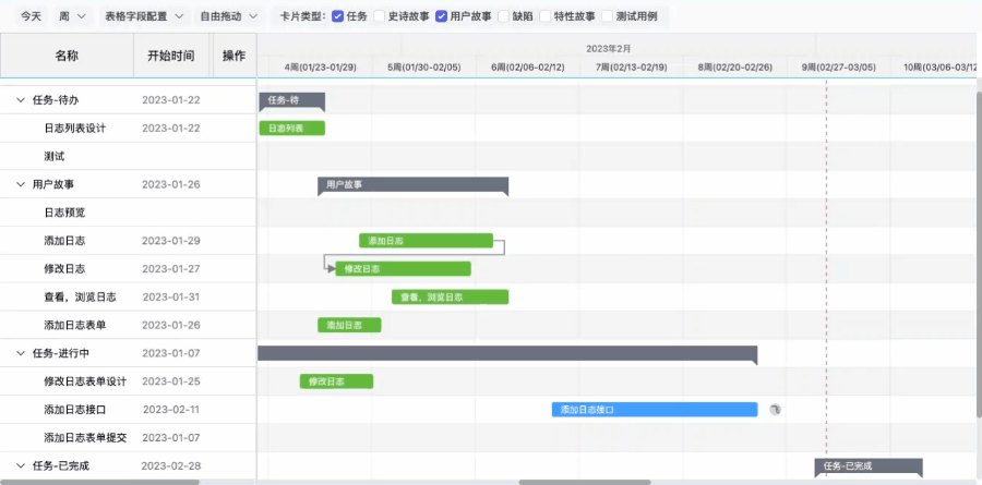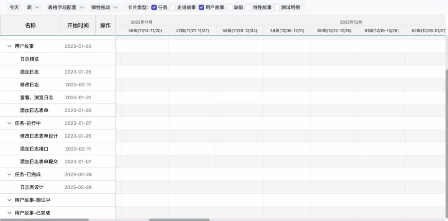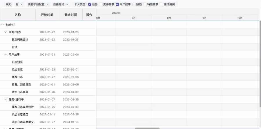 如果卡片尚未设置开始、截止时间,在时间线区域对应的所在行可以快速设置卡片的开始或结束时间。