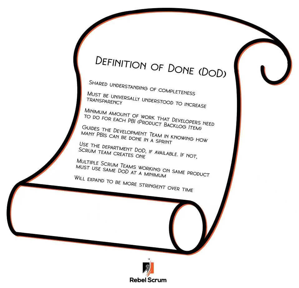 DoD(Definition of Done,完成定义)是一份团队共识的协议,描述了每个产品待办项在被视为“完成”之前所需的所有工作。例如,对于软件产品,DoD可能包含“代码审查”或“更新工作指南”这类活动。