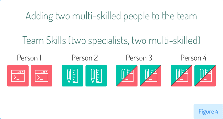 3号和4号人员是测试人员,他们除了测试之外什么都不做。他们由包含铅笔和尺子图标的绿色方块表示。你可以想象任何你想要的技能,但在这些例子中,我将使用程序员(红色)和测试人员(绿色)。