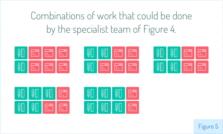 这个团队能完成的工作分配比图1的专一技能团队多得多。图5显示了在团队中加入两名多技能成员后可能出现的所有分配。