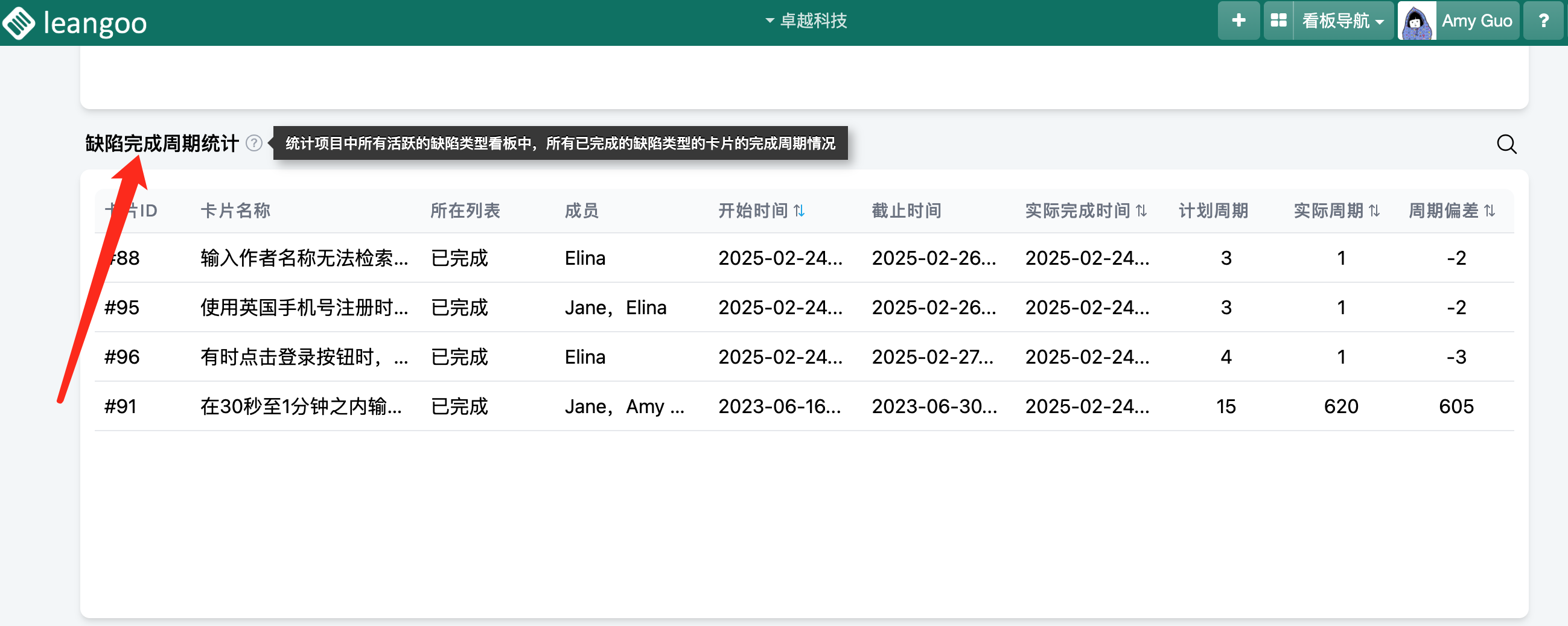 在缺陷看板设置好缺陷卡片的开始时间、截止时间,待该缺陷完成后将缺陷卡片拖拽至完成列即可显示缺陷完成周期。