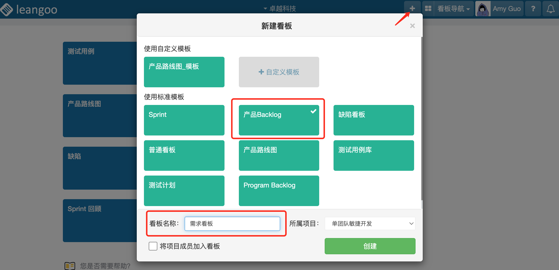 首先注册登录Leangoo系统,新建一个Scrum敏捷开发项目,在项目内新建一个产品Backlog看板,填写好看板名称,如下图: