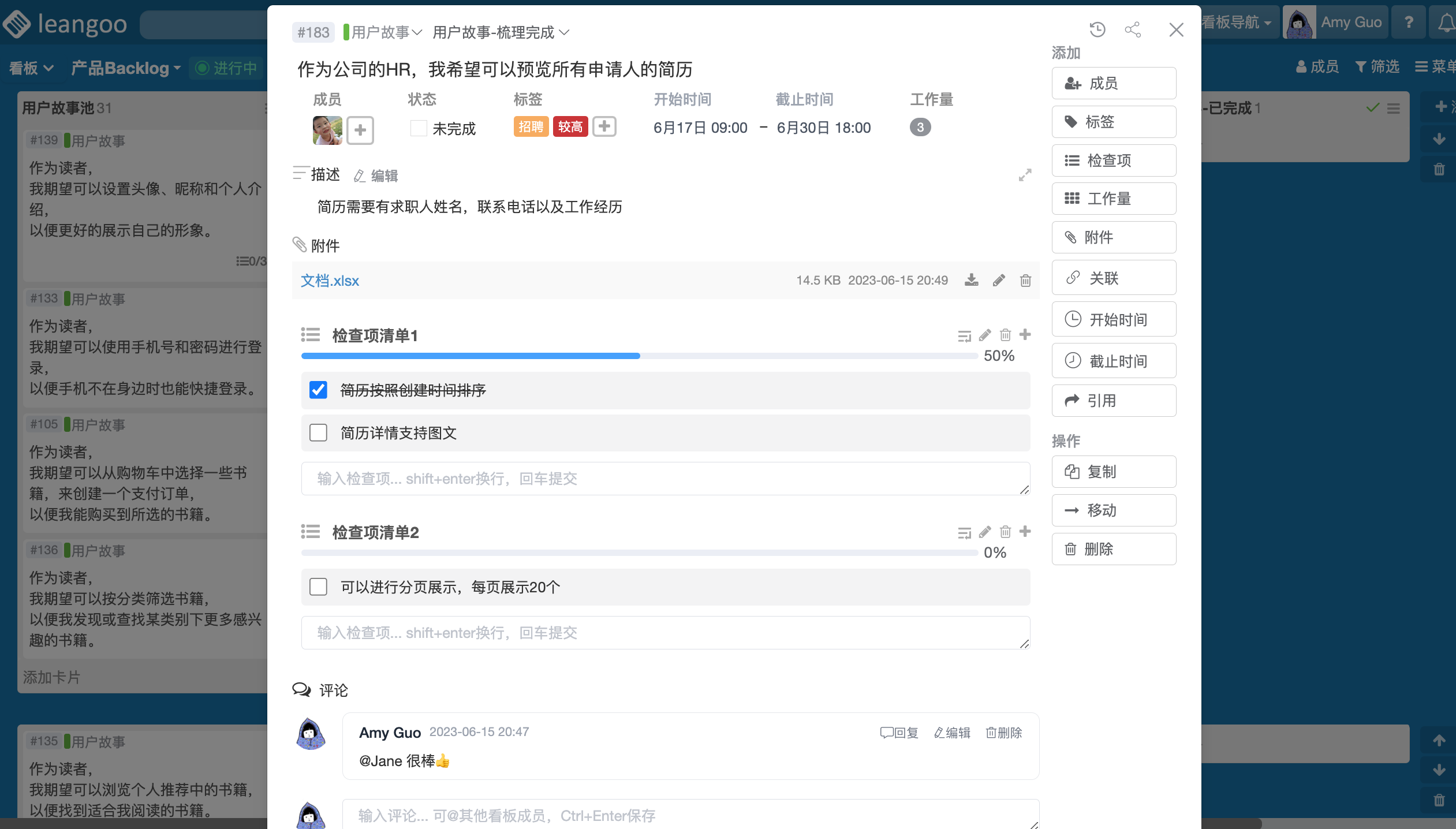 打开需求卡片,我们可以添加更多信息,比如:评论,检查项,开始截止时间、标签等,通过标签对卡片进行分类或卡片优先级排序。如下图所示: