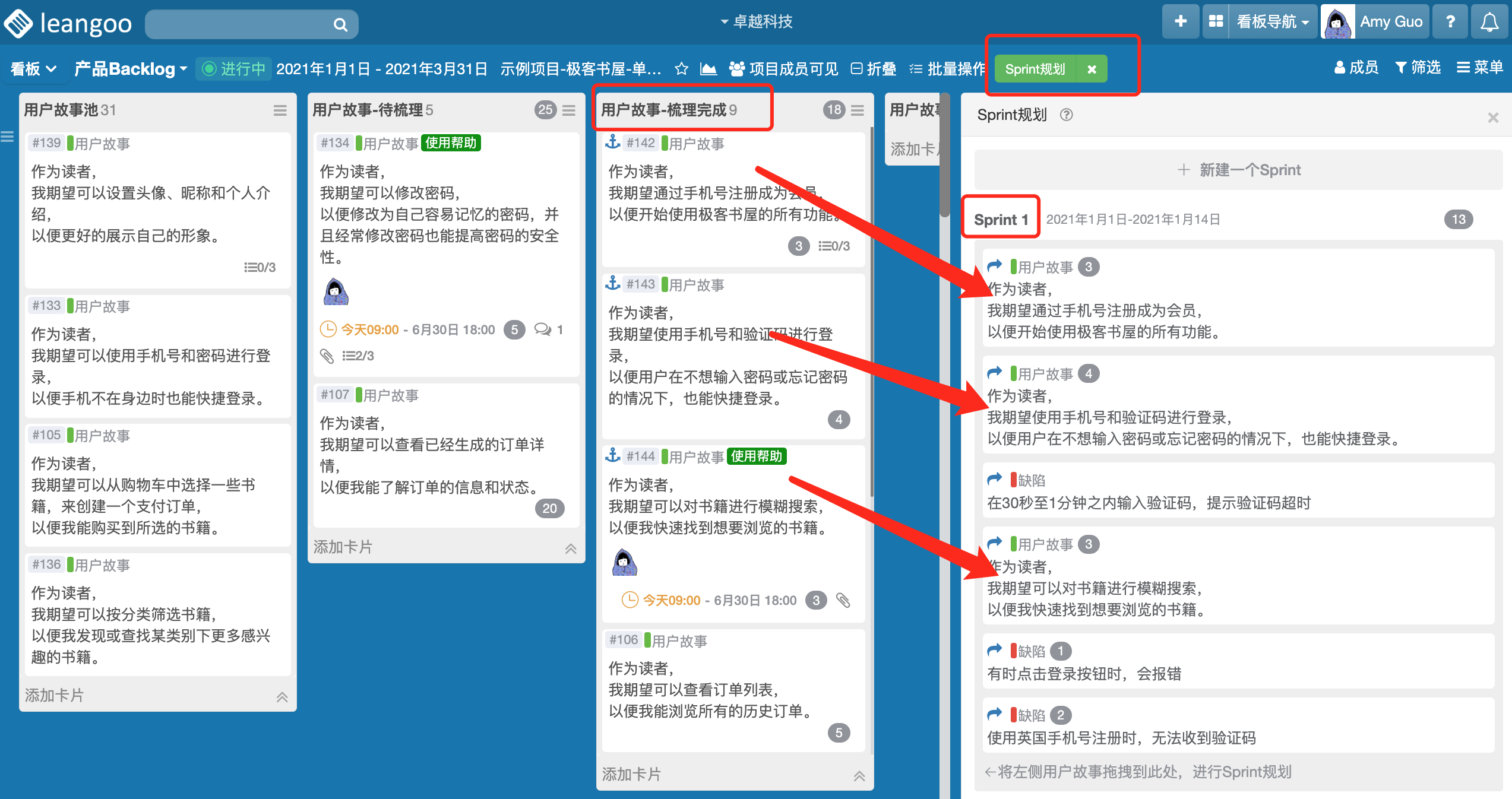 点击看板内“Sprint规划”按钮,将计划在“Sprint1”内做的用户故事拖拽到“Sprint1”看板内。