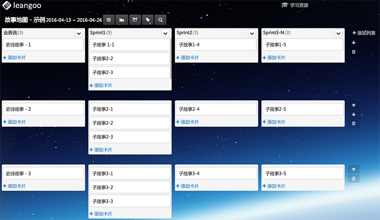 通过Leangoo看板,我们可以非常方便的通过故事地图把产品的需求全景图展示出来,产品的规划也一目了然,这对于我们持续地关注产品核心价值,更好地进行产品规划非常有帮助。