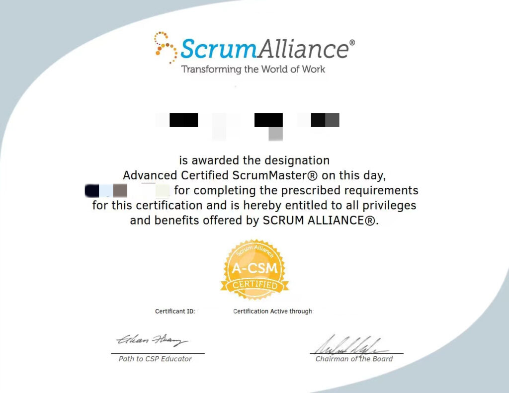 • 获得Scrum Alliance颁发的Advanced Certified ScrumMaster®(A-CSM®)认证证书,全球认可