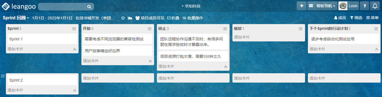 在敏捷开发中,我们每个迭代团队都会开回顾会议,这时团队可以将回顾的事项放到 Sprint回顾 看板内,然后在后续的Sprint迭代中保持高效协作的同时、逐步解决需要改进的问题。