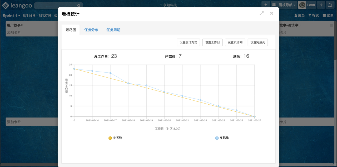 在领歌敏捷类型项目中,每个迭代类型看板中都有一个重要的Sprint进度统计 – 燃尽图。