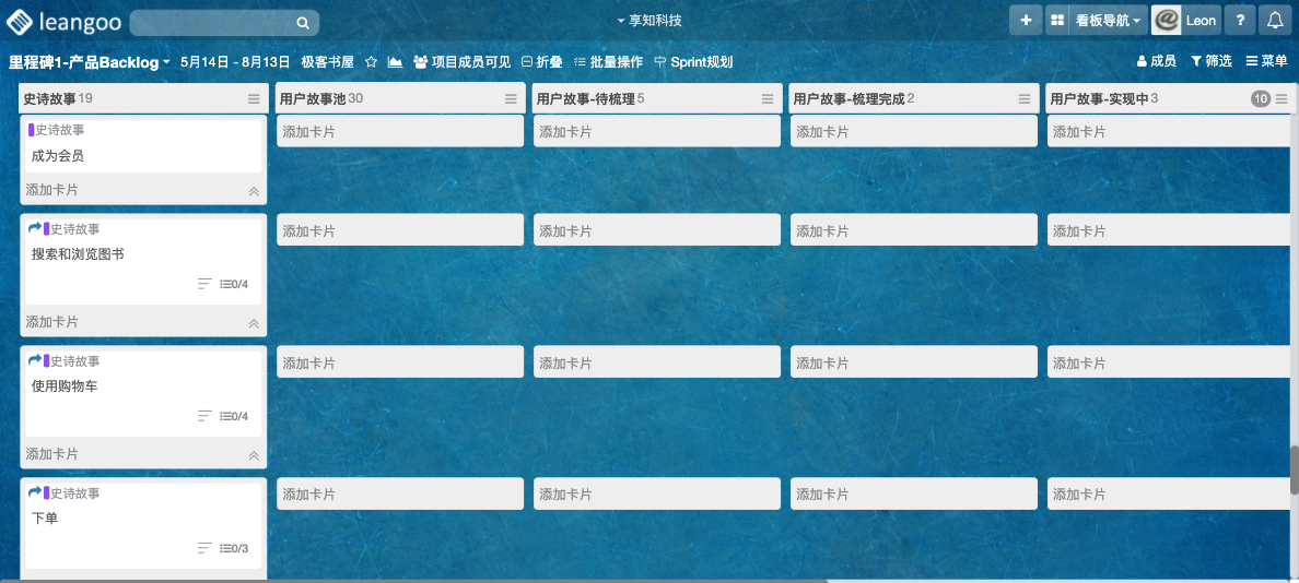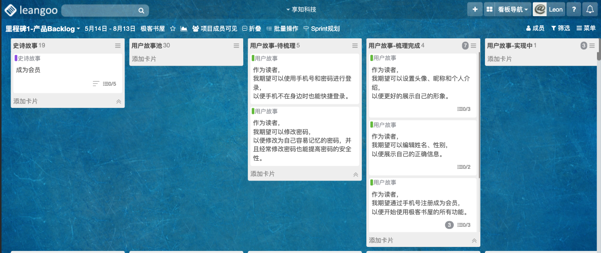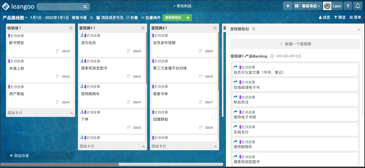 如上图例,产品路线图看板里面有多个里程碑(每个状态列表代表一个里程碑),以及达到里程碑需要完成的史诗故事。