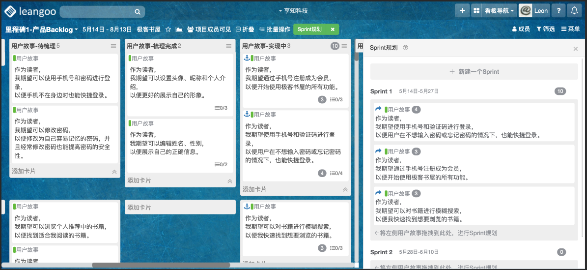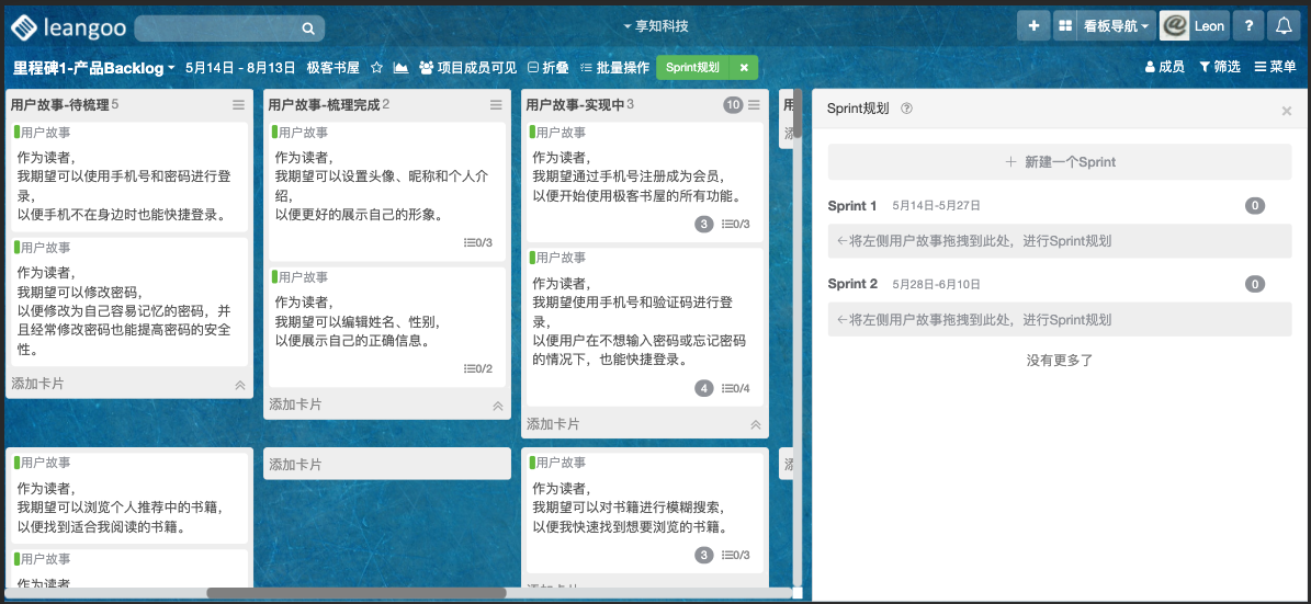 在这个里程碑看板中,我们已经将史诗故事通过规划的方式引入并放置在独立泳道内,团队接下来将这些史诗故事进行拆分,将其拆解成更小的用户故事,然后准备进行后续Sprint规划。