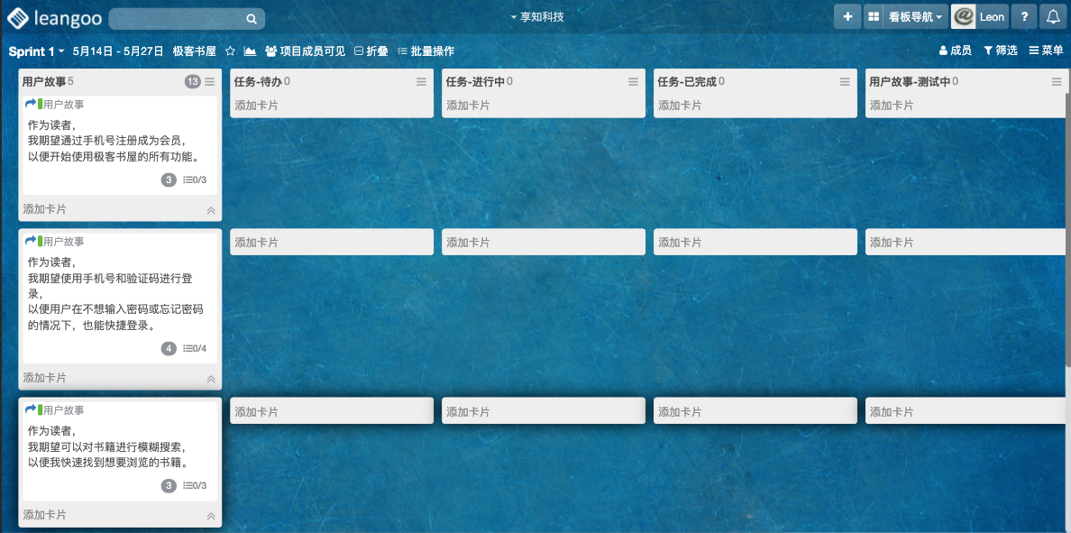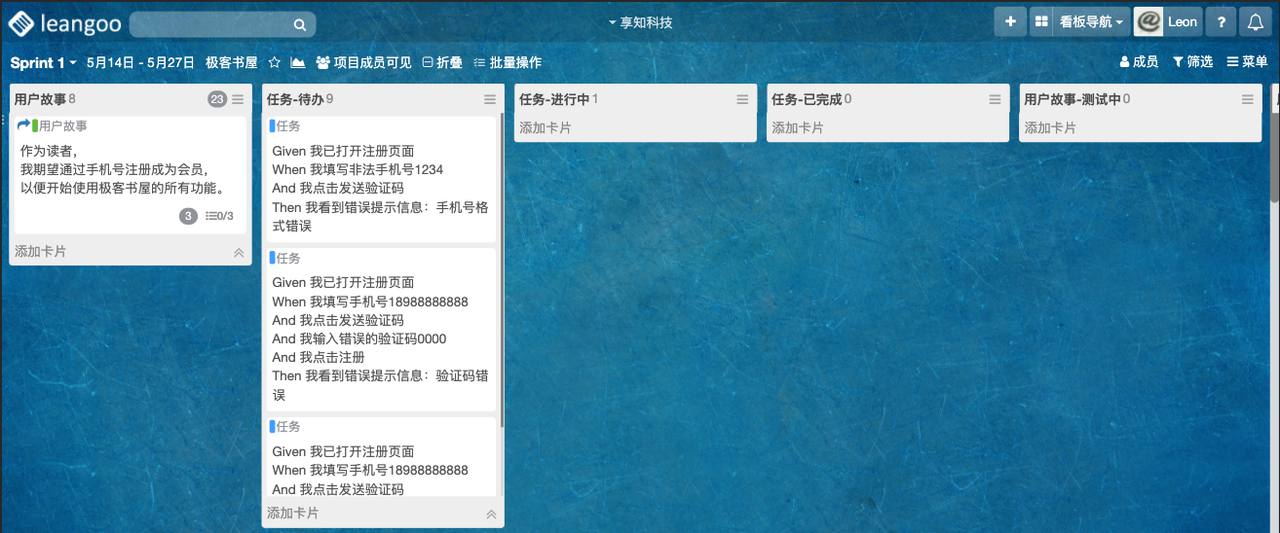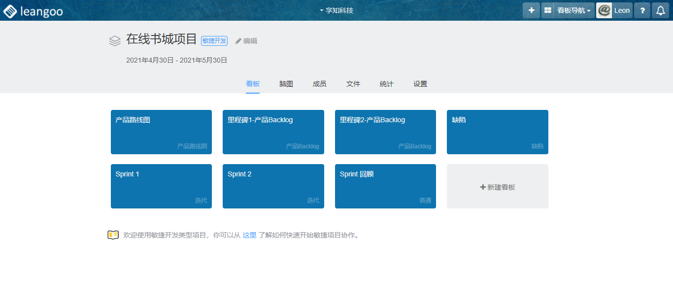 以下不同类型看板说明内容以“单团队敏捷开发-示例项目”为例,每个新注册用户都会有1-2个示例项目供参考。