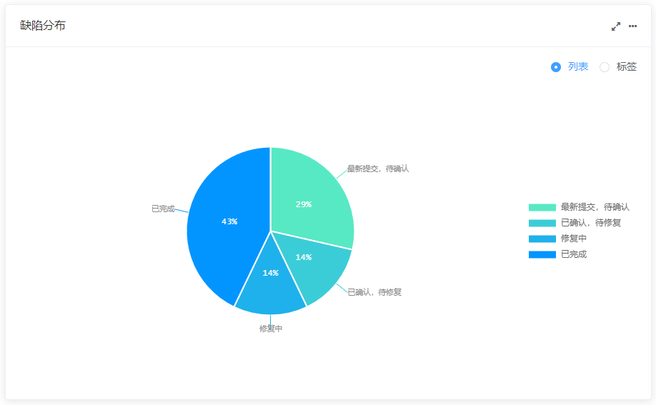 在敏捷开发类型的项目中,缺陷分布统计可以通过不同维度(列表、标签)展现项目中缺陷看板内的缺陷分布信息。