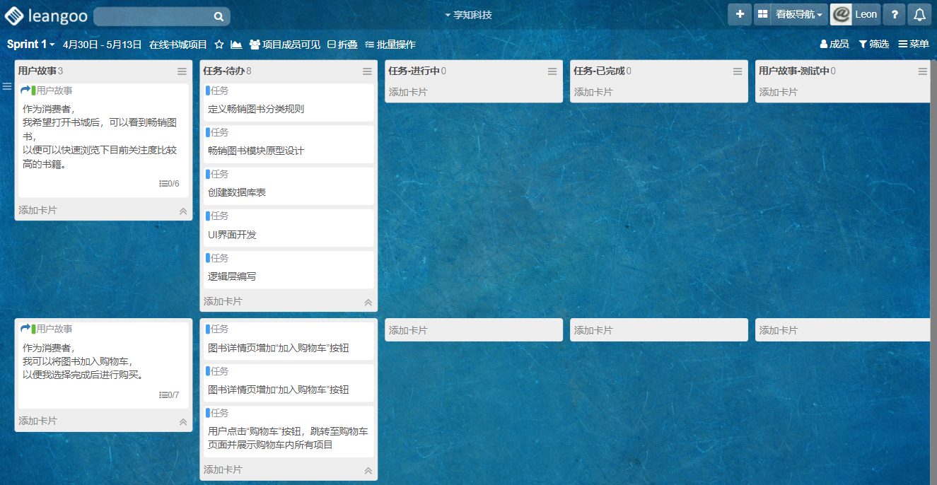 Sprint规划完成后,点击Sprint1看板名称进入Sprint1看板,我们可以看到上一步已规划的用户故事已分别放置在独立泳道中。