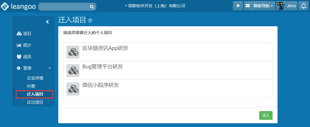 新建企业后,企业面板内默认显示的是企业项目,点击侧边栏管理菜单内迁入项目按钮,可以将团队版项目迁入到企业中。