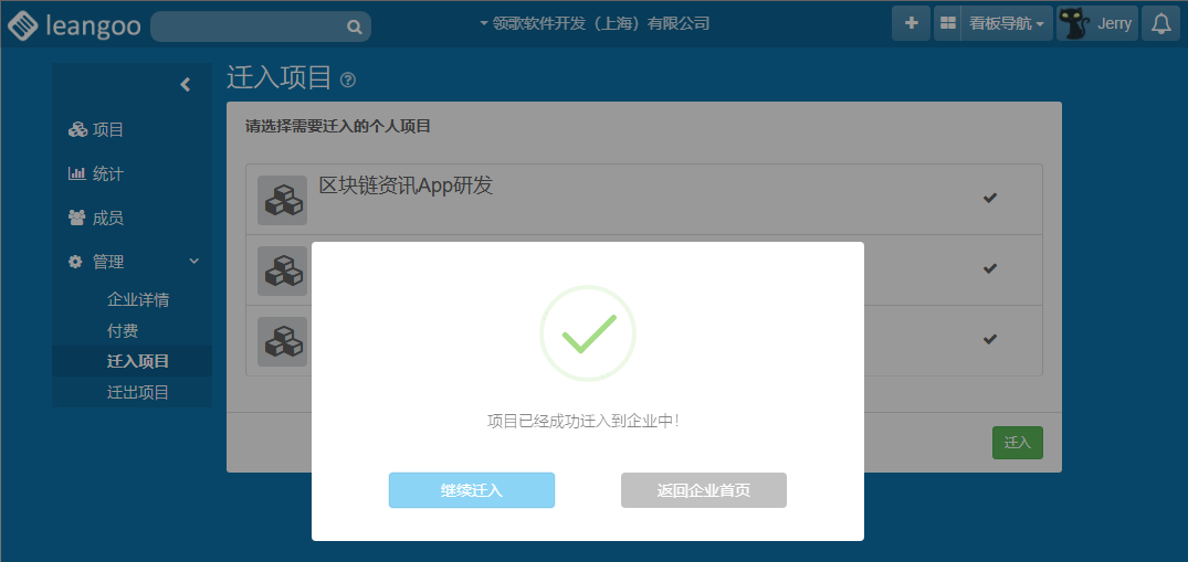 勾选需要迁入的团队版项目,点击迁入按钮,即可完成项目迁入。迁入成功后,您可以选择继续迁入或返回企业首页。迁入成功的项目会出现在企业项目列表中。