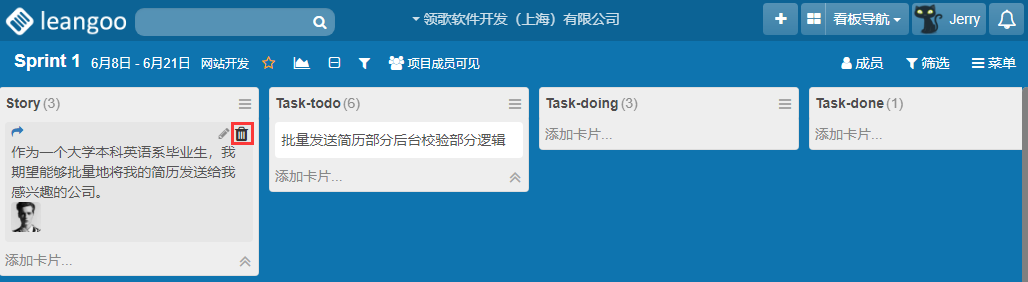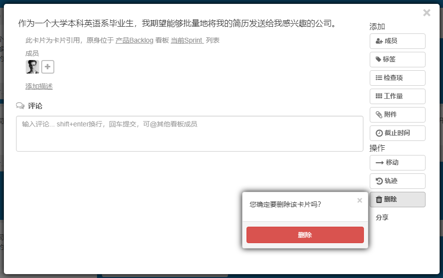 在卡片模态框内部点击删除按钮或直接在卡片上点击删除图标均可删除当前卡片。删除后的卡片可以在看板回收站中撤销。