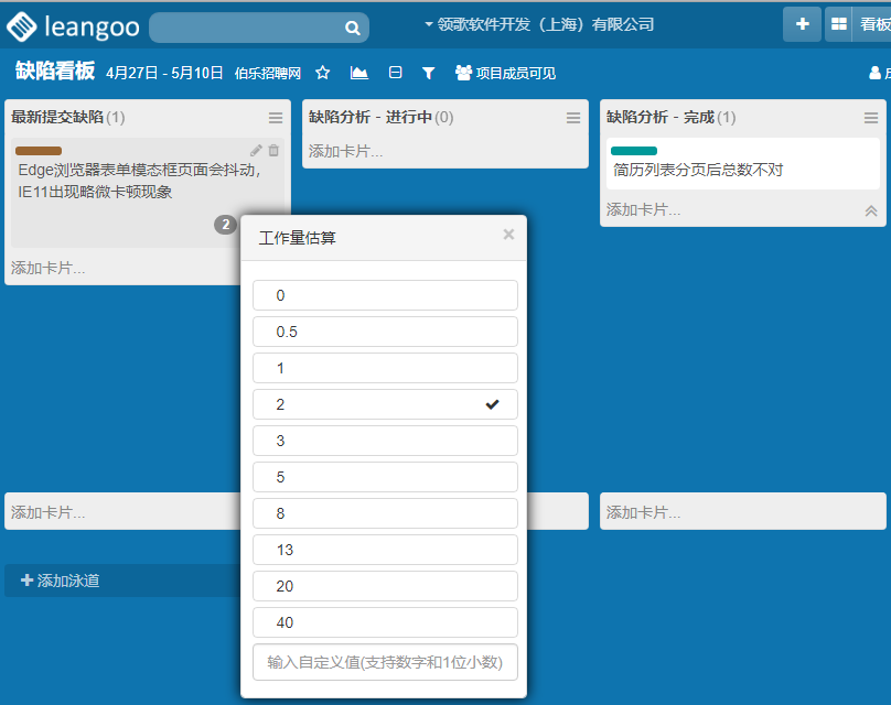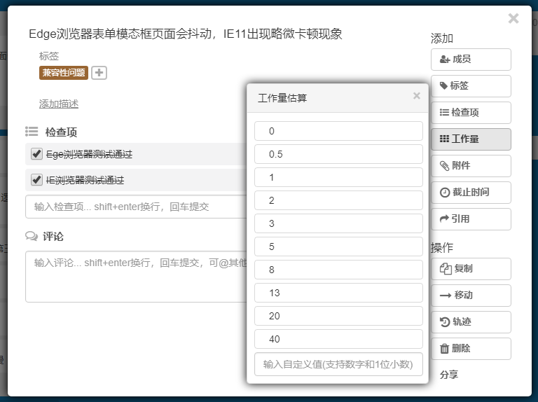 点击卡片模态框里面的工作量按钮,即可为卡片添加工作量。系统默认提供了一些常用的工作量数值,直接点击勾选即可。如果默认的工作量满足不了您的需求,您也可以通过输入框输入自定义的工作量。