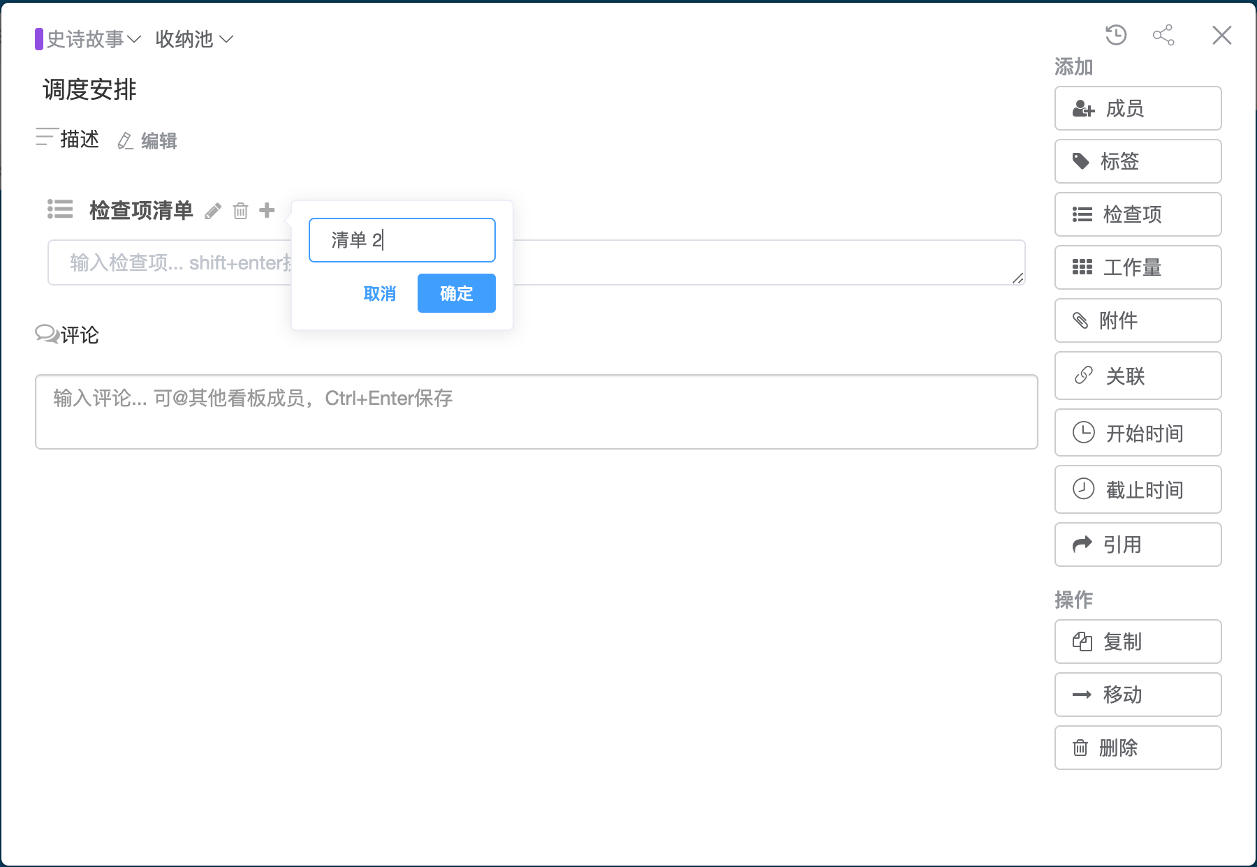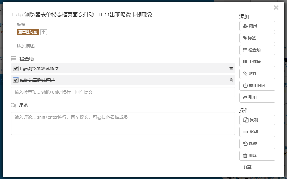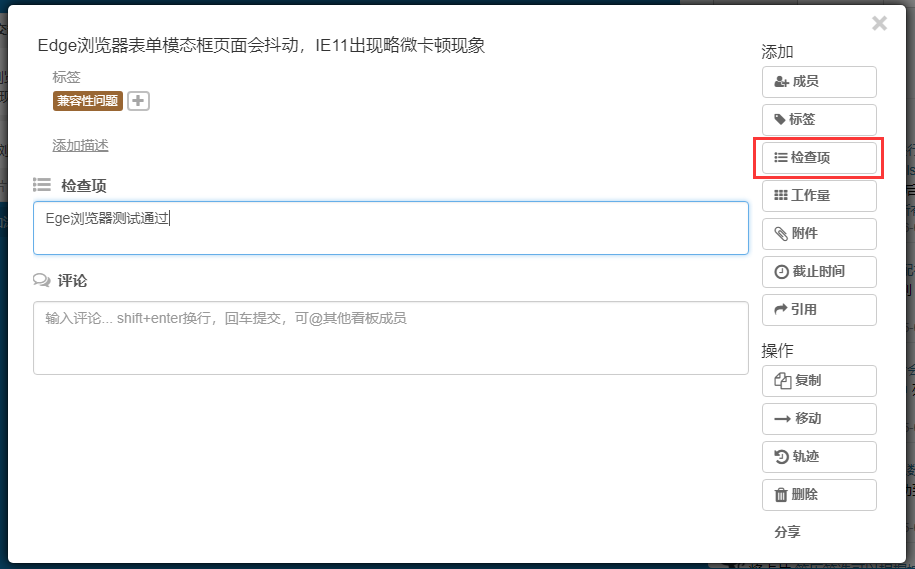 在卡片模态框里点击检查项按钮,输入检查项内容,按Enter 键即可添加一条检查项,按Shift + Enter键可以让检查项内容换行。