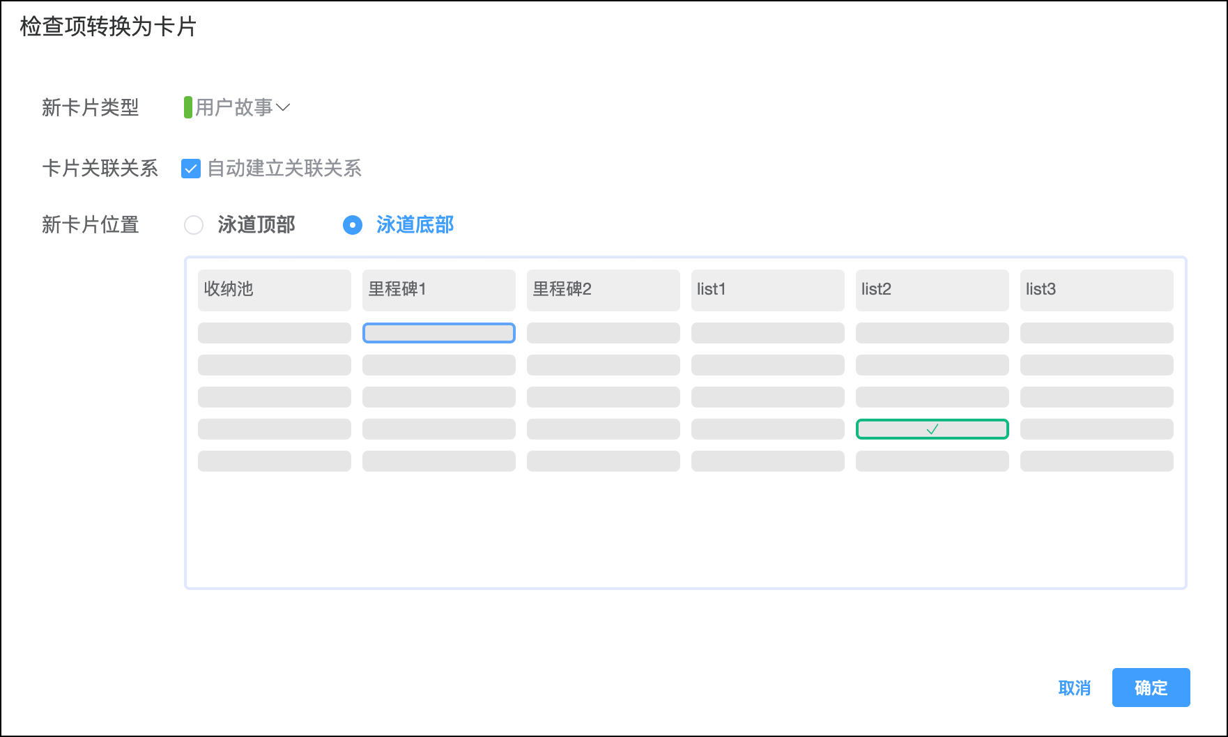 在转换界面上,可以根据需要设置新卡片的卡片类型、新卡片和当前卡片的关联关系,也可以勾选新卡片的位置。
