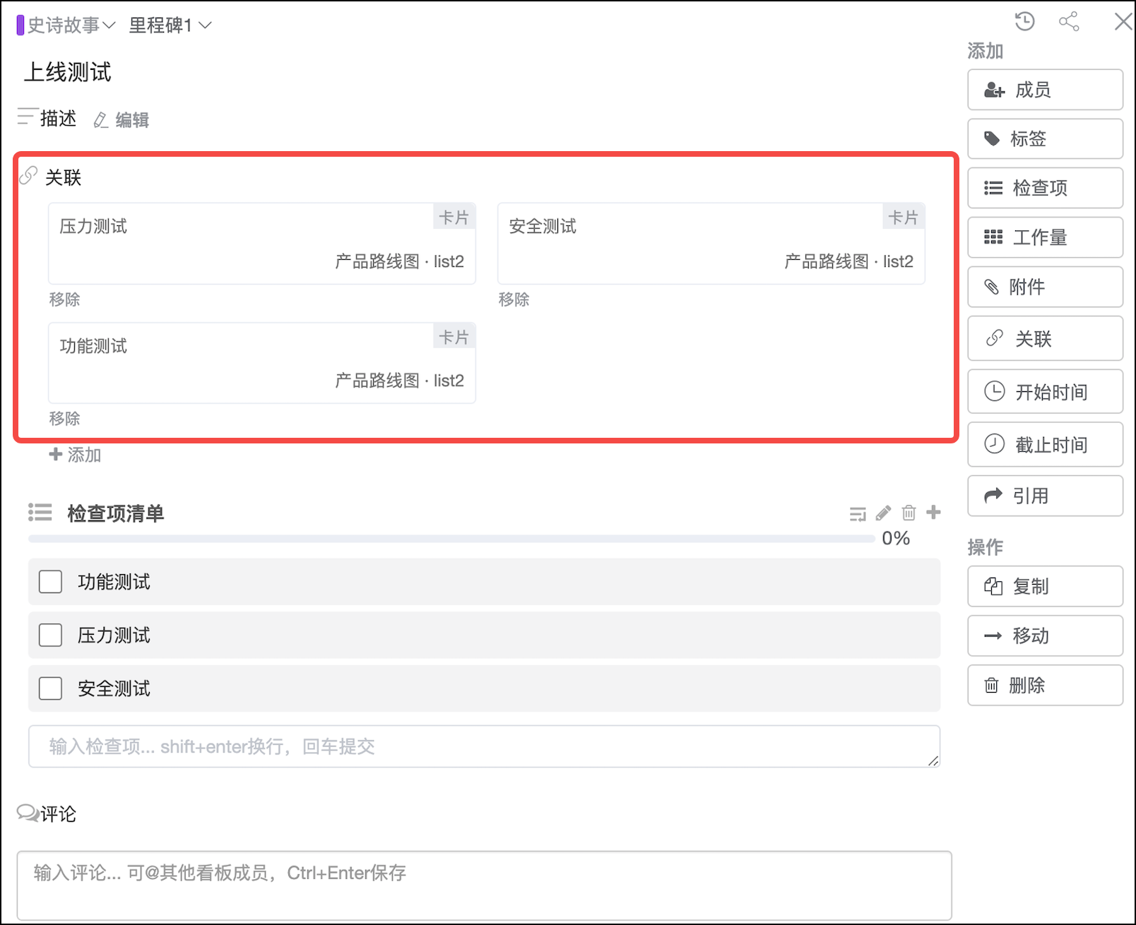卡片检查项在领歌中有很多用途,可以作为用户故事的验收条件也可以作为 bug 的测试要点等。