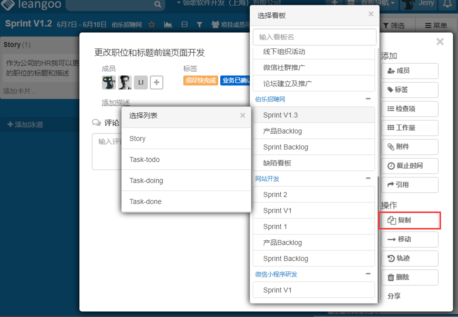 点击看板模态框里的复制按钮,可以将卡片复制到本看板或其他看板上。