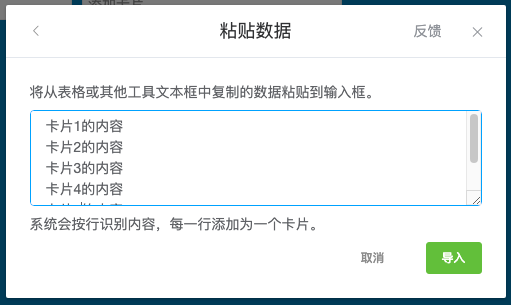 把从其他软件中复制的数据粘贴到输入框,系统会将每一行内容识别为一个单独的卡片(目前每次最多可以添加50个卡片),确认无误后点击导入按钮。