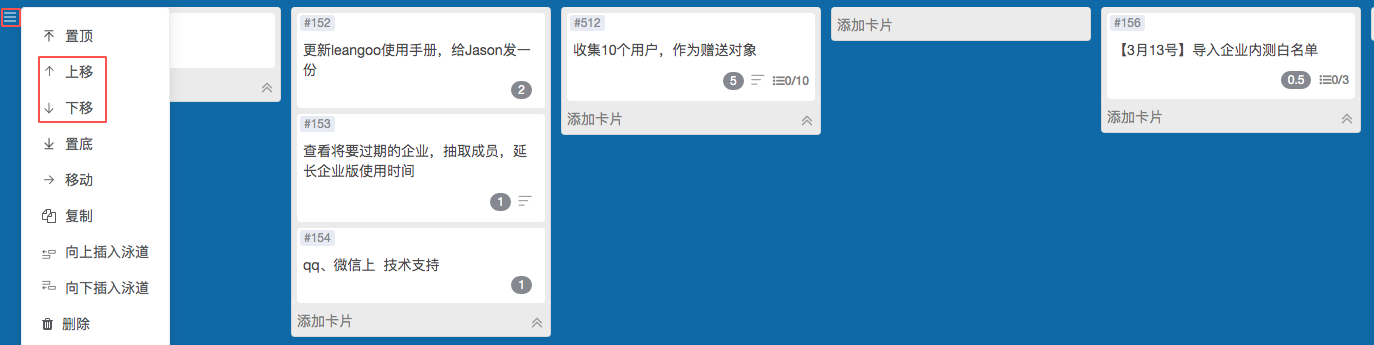 点击泳道左侧的菜单图标,点击 上移下移按钮,移动完毕后泳道会高亮显示。