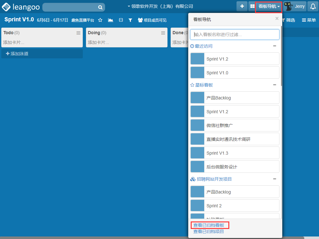 看板归档后,您可以依次点击看板导航->查看已归档看板,打开归档看板列表。