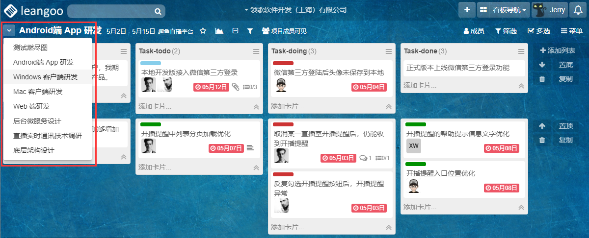 在企业版中,项目内的看板打开后,项目内成员可点击项目名称左边的倒三角按钮可展开项目看板列表,点击列表内的看板名称后可直接切换到项目的其他看板