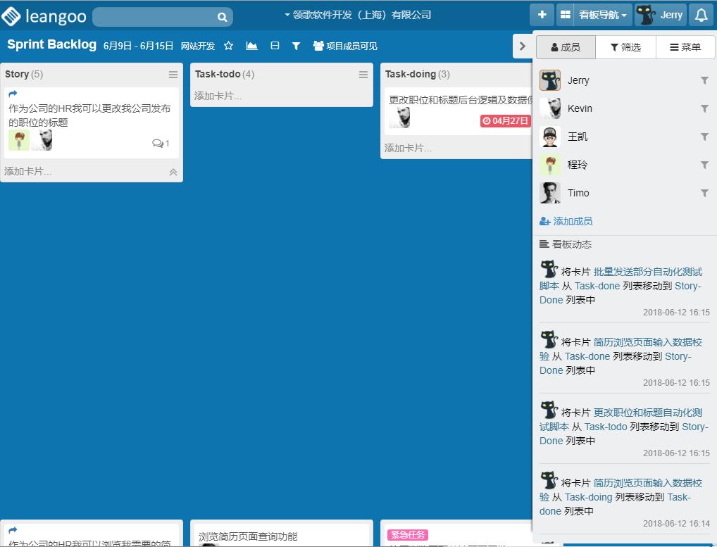 在侧边栏的成员面板里,我们可以看到看板的动态信息。看板动态记录了大部分看板中的操作并按时间倒序排列。