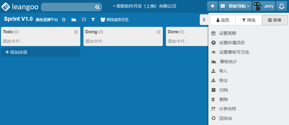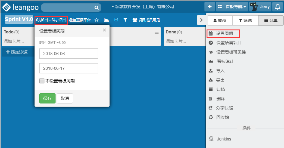 看板周期会显示在看板导航栏里面,点击看板周期或侧边栏的设置周期按钮,均可以设置看板的周期。