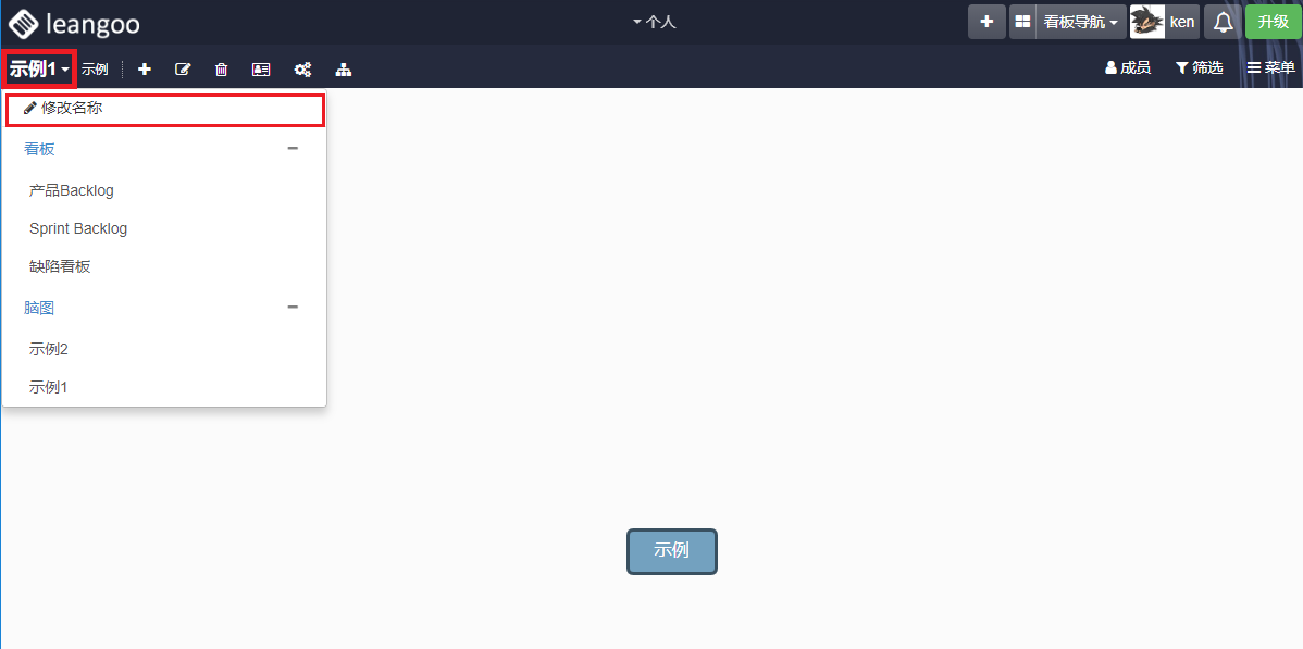 项目内的脑图打开后,项目内成员可点击脑图名称旁边的倒三角按钮,再点击修改名称对其名称进行修改。