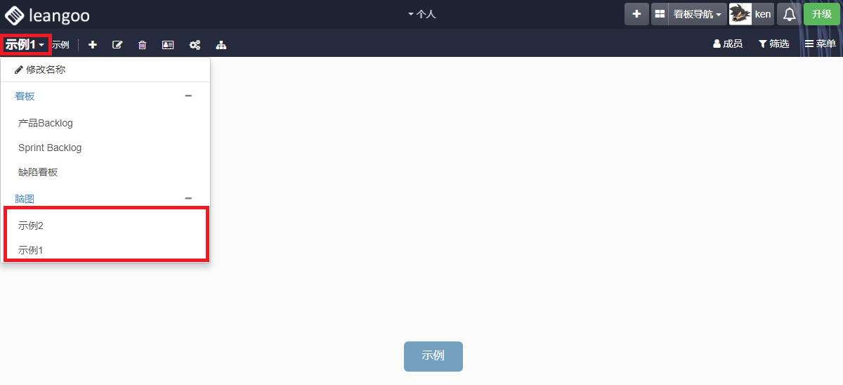 项目内的脑图打开后,项目内成员可点击脑图名称旁边的倒三角按钮,可展开项目看板与脑图列表,点击列表内的脑图名称后可直接切换到项目的其他脑图中去。