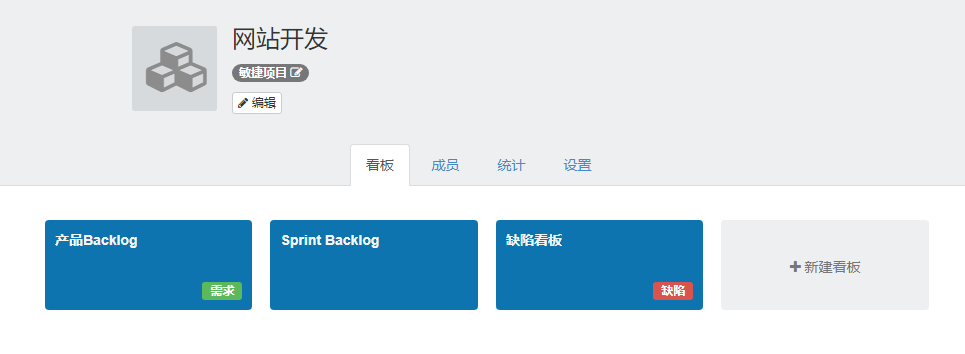3.项目创建好后,系统会默认为该项目创建三个看板:产品BacklogSprint Backlog缺陷看板
