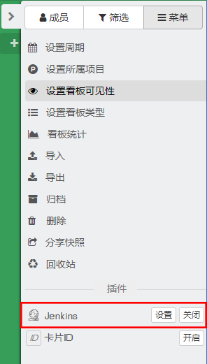 菜单,在侧边栏菜单打开后点击开启按钮,然后点击设置按钮打开 Jenkins 配置模态框