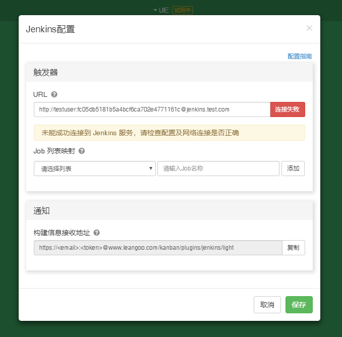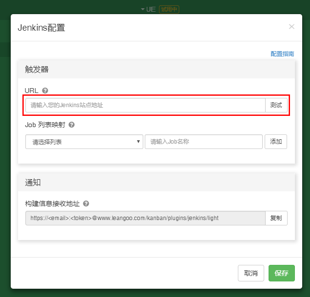 https://testuser%40sina.com:9852a8531c22c119a889bc18ec3f48d5@www.lg.team/kanban/plugins/jenkins/light- URL 地址在领歌的 Jenkins 配置模态框中已经给出,直接复制 URL ,将 email 和 token 替换成您自己的即可。