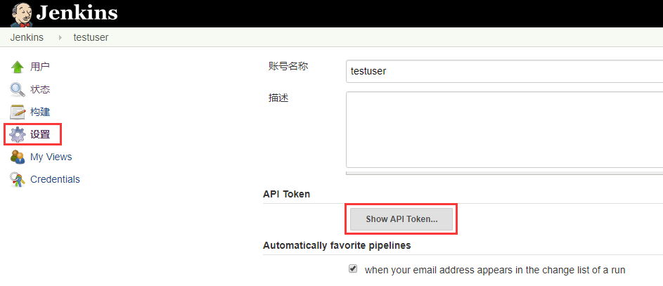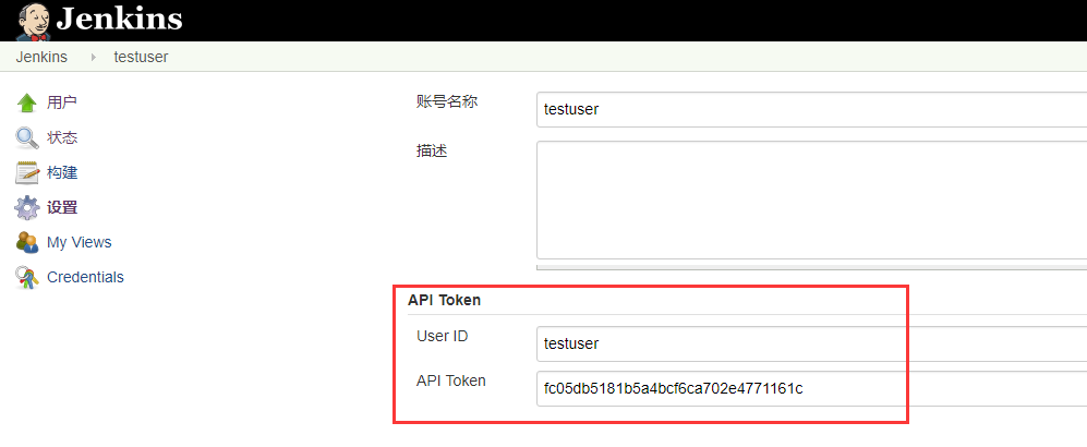 http://<User ID>:<API Token>@<Jenkins IP 地址>:端口,如果您的 Jenkins 服务器配置了域名访问,格式为http://<User ID>:<API Token>@<Jenkins 域名>。例如:http://testuser:fc05db5181b5a4bcf6ca702e4771161c@yourdomain.com。注意:您的域名用的是http协议还是https协议 - URL 中的 User ID 和 API Token 可以在您的 Jenkins 站点中获取,具体操作如下:a. 登录您的 Jenkins 站点,点击